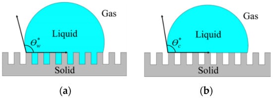 Instead of using expensive materials such as Teflon, a low-cost non-biocide-based superhydrophobic surface is one of the promising technologies for antifouling purposes. The levels of hydrophobicity and surface wettability can be determined by the water contact angle (WCA) [14,15,16]. If the contact angle of the water (surface tension, γlv = 72.1 mN m−1) is greater than 150° and has a water droplet sliding angle smaller than 10°, it is considered superhydrophobic. A water droplet can easily roll off the surface and carries off organisms, pathogens, inorganic macromolecules, and other contaminants that have a low adhesive force on the superhydrophobic surface [16]. Most engineering superhydrophobic surfaces are inspired by various natural animals and plants, such as lotus leaves, red rose petals, butterfly wings, Salvinia leaves, and shark skin, which show exceptional wetting behavior with superhydrophobicity [17,18,19,20,21,22]. The effect of surface roughness on the apparent contact angle of liquid droplets can be explained by the Wenzel and Cassie–Baxter model [23,24,25]. The liquid wets the surface in the Wenzel state and fills all voids on the rough surface, as shown in Figure 2a. In the Cassie–Baxter state, microscopic air pockets fill in the space between the rough micro- or nano-structures and the liquid droplets generate the ultimate liquid-repellent surface, as shown in Figure 2b [16].