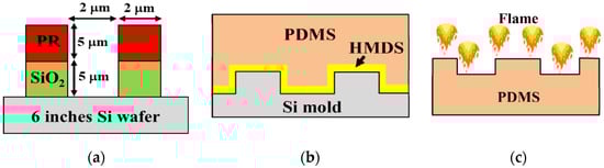 Cross-sectional schematic diagram (not to scale) of (a) PR/SiO2/Si patterning by conventional lithography and plasma etching process; (b) HMDS priming and PDMS casting on silicon master mold by soft lithography process; (c) simple flame treatment on PDMS.