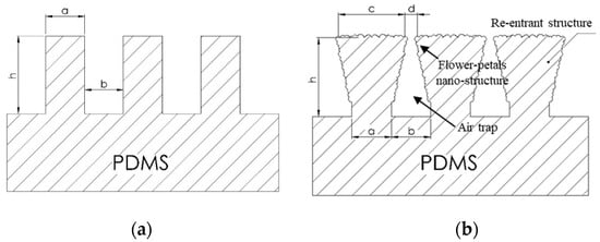 Schematic diagram of the formation of the re-entrance micro-structure by using a simple flame treatment process: (a) PDMS micro-structure before flame treatment where “a” is a designed pattern width, “b” is a designed pattern spacing, and “h” is a pattern height; (b) PDMS micro-structure with flower petal nano-structure after flame treatment where “a” is a designed pattern width, “b” is a designed pattern spacing, “c” is a pattern width of the top surface after flame treatment process, “d” is a pattern spacing of the top surface after flame treatment process, and “h” is a pattern height.