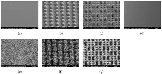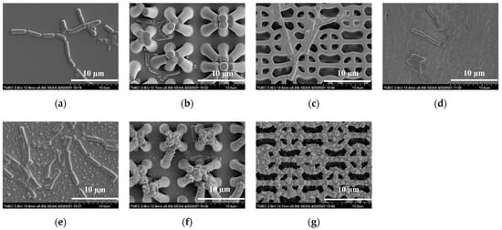 Side-view SEM images of untreated and flame-treated PDMS patterns and Teflon surfaces before bacterial adhesion testing: (a) FLT; (b) PIL; (c) C-RESS; (d) untreated Teflon; (e) FLT-F; (f) PIL-F; (g) C-RESS-F patterns.