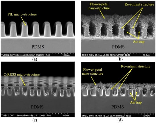 The side-view SEM images of the PDMS surfaces before and after flame treatment for 15 s are shown in Figure 5. Using HMDS priming, both PIL and C-RESS patterns were well replicated and successfully released from the Si master mold. Pattern mating, pattern clumping, and pattern collapsing were not found. Due to the limit of the resolution of the soft lithography process, nano-structures and nano-roughness did not develop on the PDMS surfaces, as shown in Figure 5a–c. After flame treatment for 15 s, wrinkles did not form on PDMS surfaces. This means the flame treatment process has a good uniform heating that does not induce surface thermal stress and micro-deformation [35]. However, flower petal nano-structures and nano-scale particles were formed on the flame-treated FLT-F, PIL-F, and C-RESS-F surfaces as shown in Figure 5e–g, respectively. The formation of the flower petal nano-structure on PDMS surfaces can be explained by the aggregation of the organosilicon compound in the PDMS matrix on the surface [35,38]. The cross-sectional SEM images in Figure 6a,c show that the pattern width (a) of the PIL pattern (a: 1.87 ± 0.3 μm) and C-RESS pattern (a: 0.50 ± 0.04 μm) were well-controlled within 10% deviation from the pattern design.