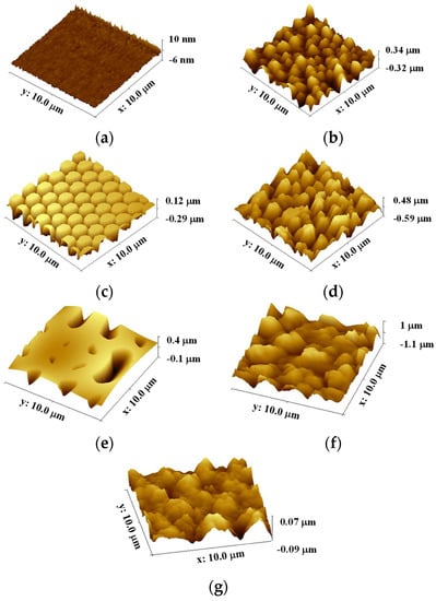 AFM images of untreated and flame-treated PDMS patterns and Teflon surfaces before bacterial adhesion testing: (a) FLT; (b) FLT-F; (c) PIL; (d) PIL-F; (e) C-RESS; (f) C-RESS-F; (g) untreated Teflon.