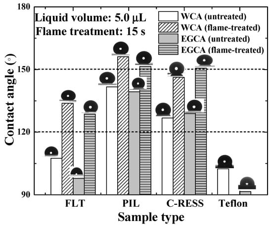 Figure 8 shows that the water contact angle (WCA) and ethylene glycol contact angle (EGCA) of the untreated FLT, PIL, C-RESS patterns, and Teflon surfaces were (107.5 ± 8.1°, 97.8 ± 7.3°), (141.7 ± 5.5°, 139.4 ± 2.3°), (126.8 ± 3.2°, 128.8 ± 5.0°), and (102.4 ± 5.1°, 91.5 ± 4.0°), respectively. After the flame treatment process for 15 s, the WCA and EGCA of FLT-F, PIL-F, and C-RESS-F patterns were (133.9 ± 3.8°, 128.6 ± 5.3°), (156.1 ± 1.5°, 151.5 ± 2.1°), and (146.3 ± 3.5°, 150.7 ± 1.8°), respectively. Due to the low surface roughness of flat PDMS and flat Teflon samples, the surface did not possess any superhydrophobic properties. After the flame treatment process, the PIL-F pattern showed superamphiphobic properties with the WCA and the EGCA greater than 150°. In contrast, the C-RESS-F pattern showed hydrophobic and superoleophobic properties. The summary of the measured pattern size, surface roughness, WCA, and EGCA of various PDMS patterns and Teflon surfaces before and after the flame treatment process for 15 s is shown in Table 1.