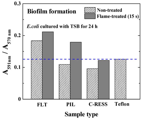 As mentioned earlier, the absorbance ratios of the bacterial stain and bacterial culture per surface area (≈3.238 cm2) were used to determine the biofilm mass accumulation on the material surfaces. The results in Figure 10 show that the absorbance ratios (A591 nm/A570 nm) of FLT, PIL, C-RESS, and Teflon surfaces were 0.183, 0.109, 0.095, and 0.113, respectively. The bacterial adhesions on PIL and C-RESS patterns were 3.5%, and 15.9% reduced compared to the Teflon surface. Therefore, the unique surface topology of C-RESS and C-RESS-F patterns with a smaller size of micro-pattern (a: 0.5 µm, b: 0.5 µm) than the size of E. coli (a: 0.5 µm, length: 2.0 µm) can suppress the bacterial adhesion. After flame-treatment for 15 s, the absorbance ratio (A591 nm/A570 nm) of the C-RESS-F pattern was 42.6%, 31.8%, and 2.9% reduced compared to FLT-F, PIL-F, and Teflon surfaces, respectively. However, the bacterial anti-adhesion property of the C-RESS-F pattern is poorer than the C-RESS pattern but still comparable with Teflon.