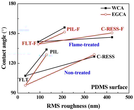 The flower petal nano-structure on the PDMS surface was developed by surface modification using a simple flame treatment process, as shown in Figure 3c and Figure 4a,b [35,36,37,38]. This flower petal nano-structure behaves like a re-entrant micro-/nano-structure, exhibiting superhydrophobic and superoleophobic surfaces in the Cassie–Baxter state. An amount of 2.64 g of bulk paper wipe was used as the flame source in this process. An amount of 11.26 g of ethanol (C2H5OH, Merck group, Darmstadt, Germany) was used as a burner to produce a large flame size with good flame stability. Then, 13.90 g of soaked paper wipe was burned for 1 min to remove its contamination and stabilize the laminar flame profile with the temperature of the post-reaction zone at 700 ± 20 °C. The flame-to-surface distance was kept at 20 mm. Three sets of the PDMS samples were exposed to the post-reaction zone of the flame by moving back and forth along their 2.0 cm width from one end to the other within 1 s for eight times, resulting in a flame contact time of 15 s [38]. Hence, the flame-treated flat PDMS (FLT-F), PDMS-PIL (PIL-F), and PDMS-C-RESS (C-RESS-F) surfaces were fabricated. Note that the flame treatment process was not applied on the Teflon surface.