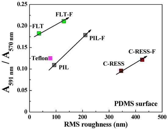 In Figure 9c,g, SEM images show that the E. coli adhered only on the top surface of the C-RESS-F pattern. However, the absorbance ratio (A591 nm/A570 nm) in Figure 10 reveals that the bacterial anti-adhesion property of the C-RESS-F pattern is poorer than the C-RESS pattern. This might be due to the excess nano-roughness on flower petal nano-structure increasing the surface area for bacterial attachment and providing a scaffold for adhesion [54,55]. It was reported that if the pattern height is larger than the bacteria size, the bacteria can easily adhere to the sidewall of the micro-structure to form the biofilm [49]. Therefore, the bacteria might have attached to the flower petal nano-structure and the sidewall area of the C-RESS-F micro-structure. Based on these results, the effect of surface roughness might overcome the superhydrophobic and superoleophobic properties on the bacterial anti-adhesion of the flame-treated PDMS patterns.