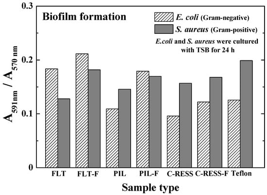 Measurement of static biofilm formation followed the method from previous works [40,41] with some modifications. In this experiment, E. coli working stock was inoculated in TSB media by agitation at 37 °C for 24 h. The cell concentrations in the broth cultures were adjusted in the TSB media by measuring the absorbance in the range 0.01 to 0.02 arbitary units (a.u.), (λ = 540 nm) using an ultraviolet–visible (UV-VIS) spectrophotometer (Thermo Scientific Orion, AquaMate 8000, Göteborg, Sweden). The target concentration of E. coli cultures was approximately 106 CFU/mL. Before testing, all PDMS samples (FLT, FLT-F, PIL, PIL-F, C-RESS, and C-RESS-F) and Teflon (control sample) were sterilized using an autoclave at 121 °C for 30 min with a saturated steam pressure of 15 pound force per square inch (psi).