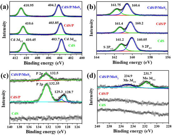High resolution XPS spectra of CdS, CdS/P and CdS/P/MoS2: (a) Cd 3d; (b) S 2p; (c) P 2p and (d) Mo 3d.