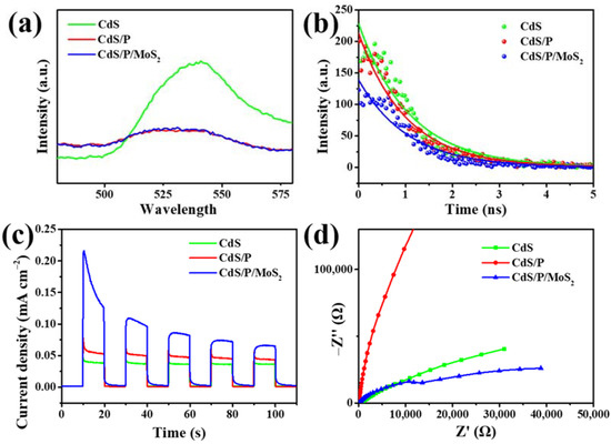 Performance tests of CdS, CdS/P and CdS/P/MoS2: (a) photoluminescence (PL) spectra; (b) transient PL spectra; (c) transient photocurrent response curves; (d) electrochemical impedance spectra (EIS).