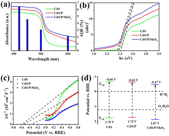 Characterization of CdS, CdS/P and CdS/P/MoS2: (a) UV-vis diffused reflectance spectra (DRS) and AQE of CdS/P/MoS2; (b) Corresponding Tauc plots of DRS; (c) Mott–Schottky (MS) plots and (d) Schematic band structure diagrams.