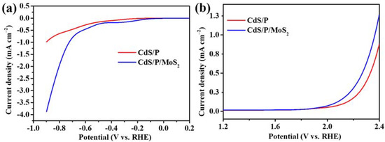 The effect of MoS2 as a cocatalyst in the photocatalytic process can be further characterized by the electrocatalytic hydrogen evolution reaction and oxygen evolution reaction, which in turn provide more clues to characterize the reactive activity of photocatalytic oxidation and reduction [62]. Figure 7 shows the electrocatalytic H2 evolution reaction (HER) curve and oxygen evolution reaction (OER) curves of CdS/P and CdS/P/MoS2 tested by linear sweep voltammetry. It can be seen that the in situ photodeposition of MoS2 can significantly reduce the HER and OER overpotentials at the same time. Therefore, it can be inferred that the conduction band of CdS is located in a more reductive zone compared to the composites (Figure 6d), but its H2 reduction rate seems to be less. This is because the kinetics of photocatalytic H2 evolution reaction on the surface of CdS is sluggish. The in situ photodeposited MoS2 cocatalyst can significantly reduce the dynamic barrier of H2 evolution reaction on the surfaces of CdS/P/MoS2 and CdS/MoS2. Therefore, after the loading of MoS2, the rate of photocatalytic H2 evolution for CdS/P/MoS2 and CdS/MoS2 are increased significantly.