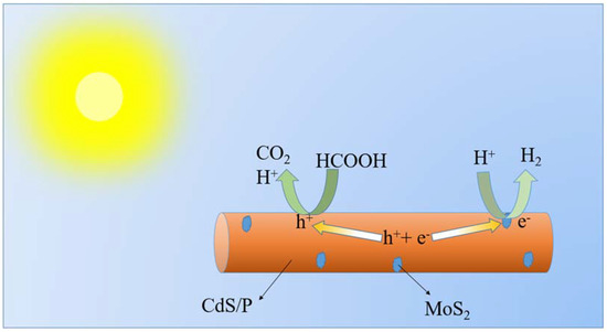 Based on the above results, a reasonable mechanism of photocatalytic H2 evolution by CdS/P/MoS2 in the formic acid solution was summarized. As shown in Scheme 1, photoinduced charges are firstly generated when the photocatalyst receives light radiation. The Schottky energy barrier generated by the interfacial interaction between CdS/P and MoS2 can promote the transfer of the photogenerated electrons from CdS/P to the surface-loaded MoS2 cocatalyst. Photogenic holes remain in CdS/P and migrate to the surface. The combination of MoS2 as a cocatalyst with CdS/P could synergistically reduce the energy barriers of photocatalytic HER and OER, resulting in the reduction in H+ in the formic acid solution by photogenerated electrons in MoS2 to generate H2, while the photogenerated holes are consumed by formic acid. In summary, CdS/P/MoS2 photocatalyst can realize a significant efficiency in the photocatalytic H2 evolution in the formic acid solution.