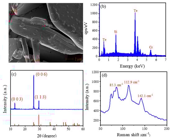 Crystal structure of the Cr2Si2Te6 nanosheets. (a) SEM image with 2 µm resolution. Inset: SEM image with 1 µm resolution. (b) EDX spectroscopy. (c) XRD. (d) Raman spectrum.