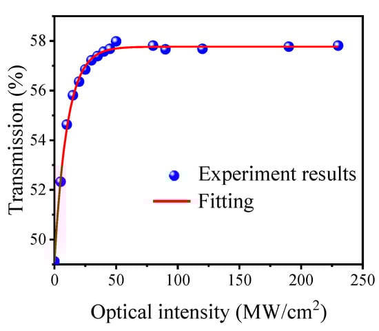 The nonlinear absorption characteristic of the Cr2Si2Te6-PVA film is investigated by the commonly used balanced twin detector measurement scheme. A mode-locked EDF laser based on a nonlinear polarization rotation regime is used as the pump source, and the center wavelength, repetition rate, and pulse duration are 1581 nm, 33.6 MHz, and 560 fs, respectively. The intensity-dependent nonlinear normalized saturable absorption curve is presented as blue dots in Figure 2. Using a fitting analysis, presented as a red line, the data agree well with the curve of the saturable absorption formula: