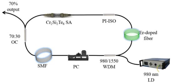 The high power large-energy mode-locked EDF laser based on Cr2Si2Te6-SA is schematically depicted in Figure 3. A piece of 10-m long EDF is adopted as the gain medium. A 980 nm laser diode (LD) with a maximum output power of 1250 mW is employed as a pump source, which is coupled into the ring cavity through a 980/1550 nm wavelength division multiplexer (WDM). A polarization independent isolator (PI-ISO) is utilized to guarantee the unidirectional transmission of the light. An in-line polarization controller (PC) is used to fine tune the polarization state of the cavity. As high as 70% of the laser power is extracted out of the cavity by an optical coupler (OC). The Cr2Si2Te6-SA is inserted between the PI-ISO and the OC to enable the mode-locked operation. The dispersion coefficients of EDF and single-mode fiber (SMF) are −18 ps/nm/km and 17 ps/nm/km, respectively. Considering that the four pieces of SMFs adopted in the proposed experiment are 230, 285, 325, and 380 m long, the net dispersions of the ring cavity are −4.77, −6.11, −7.02, and −8.21 ps2, respectively. The output signal is monitored by a digital oscilloscope (OSC) (Wavesurfer 3054, LeCroy, Teledyne, USA) with a 3-GHz photo-detector (PD 03), an optical spectrum analyzer (OSA) (AQ6370B, Yokogawa, Tokyo, Japan), and a radio frequency spectrum analyzer (FPC1000, Rohde & Schwarz, Jena, Germany), while the average output power is measured by a power meter (PM3, Molectron, Barrington, NJ, USA).