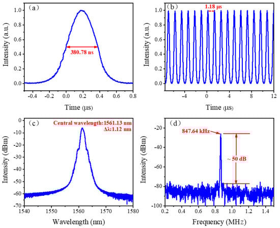 As a general indicator used to characterize the stability of a mode-locked fiber laser, the single-to-noise ratio (SNR) represents the contrast between detected pulses and background noise signals. To obtain the SNR, the radio frequency (RF) spectrum of the mode-locked pulses is scanned. As depicted in Figure 4d, the SNR is measured to be about 50 dB, and the fundamental frequency repetition rate is 847.64 kHz. The former exhibits the high stability of the system, and the latter indicates that the repetition rate is consistent with the pulse interval (f = 1/T), which further confirms the mode-locked state of the system.