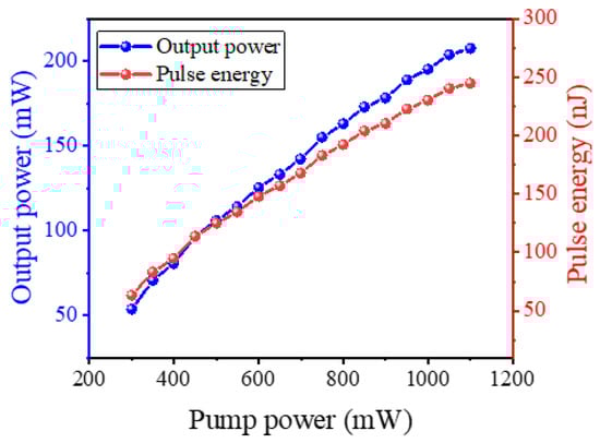 Figure 5 depict the output power and pulse energy as functions of pump power. Both the output power and pulse energy almost increase linearly with the pump power. When the pump power is 1100 mW, the obtained largest output power is 207.47 mW, corresponding to an optical-to-optical conversion efficiency of 18.9%. It is worth emphasizing that the obtained maximum pulse energy is 244.76 nJ, which is significantly greater than the conventional mode-locked operations. The results indicate high stability in a large pump power range.