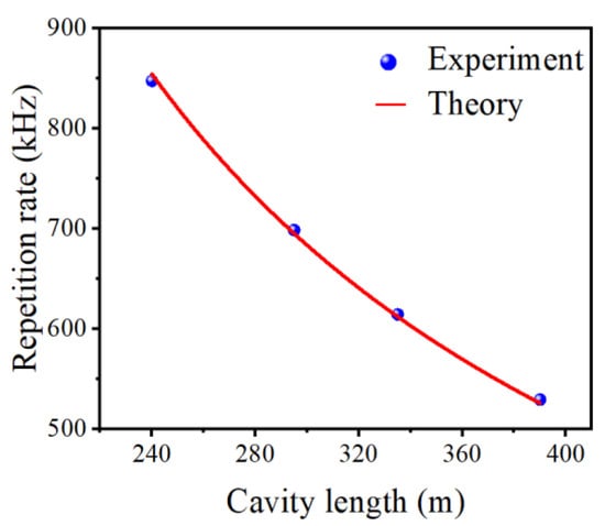 In order to obtain large-energy pulse generation, according to (2), the proposal in our work is to reduce the repetition rate by extending the SMF in the laser cavity. As a result, the accumulated power in the cavity will be distributed to fewer mode-locked pulses, and hence the energy for each pulse will be enlarged. In the actual implementation process, four SMFs with lengths of 230, 285, 325, and 380 m are successively adopted. As shown in Figure 6, the fundamental frequency pulse repetition rate of the mode-locked fiber laser decreases with the extending of the SMFs, which is consistent with our deduction. Theoretically, the repetition rate (f = 1/T = ) is inversely proportional to the cavity length, which is shown by the red curve in Figure 6. Apparently, the experiment data (blue dots) match well with the theoretical value. The slight deviation mainly comes from the inaccurate measurement of the fiber length and is negligible. Such results reveal high stability in a large cavity length range.
