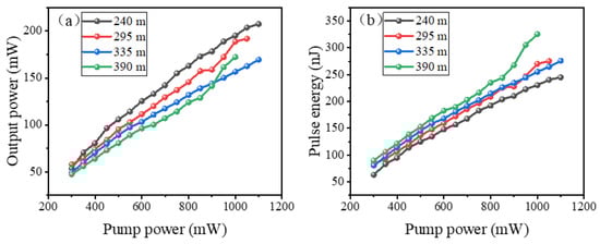 The variations of output power with pump power under the conditions of different cavity lengths are illustrated in Figure 7a. It is seen that, at the same pump power level, the average output power tends to decrease with the increase of the cavity length, and the highest output power is obtained by the shortest cavity. The reason is that the laser gain in the cavity is limited by the gain fiber with definite length as well as the pump power with a definite level. If the optimum cavity length is exceeded, the redundant SMF will absorb the laser oscillating in the cavity hence the total power decreases with the extending of the SMF. However, under the conditions of different cavity lengths, the pulse energy, as illustrated in Figure 7b, shows contrast results, i.e., the pulse energy increases with the extending of the SMF, and the largest pulse energy is achieved by the longest cavity. This can be explained by the relationship formula