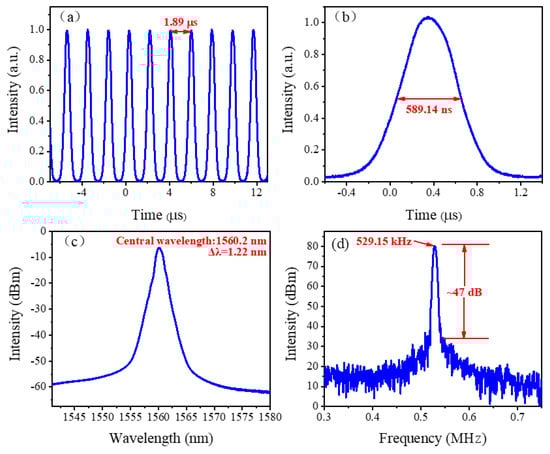 In the experiment, the largest pulse energy is achieved when the cavity length is 390 m. In detail, the pulse sequence and the single pulse envelope are exhibited in Figure 8a,b, respectively. It is presented that the pulse interval is 1.89 μs, and the pulse duration is 589.14 ns. The spectrum shown in Figure 8c is centered at 1560.20 nm with a 3 dB bandwidth of 1.22 nm. The measured SNR is 47 dB, and the fundamental frequency repetition rate is 529.15 kHz, which is exhibited in Figure 8d. The available maximum output power is 172.24 mW, so the largest pulse energy is calculated to be 325.50 nJ. During the process, the length of gain fiber remains unchanged, and when the pulse repetition rate is reduced from 847.64 kHz to 529.15 kHz by extending the length of SMF, the pulse energy is successfully scaled up from 244.76 nJ to 325.50 nJ. To our best knowledge, this is the largest pulse energy obtained in mode-locked fiber lasers modulated by 2D material SAs so far.