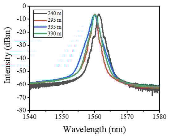 The optical spectra of the four lasers with different cavity lengths are separately measured at the highest output power level. As depicted in Figure 9, it is seen that although the cavity lengths are different, there are no obvious changes in the optical spectra. The little shift between the spectrum output by the 240-m-long cavity and the other three spectra might be induced by the slight environmental changes because the time interval between the first experiment and the other three experiments is about three months.