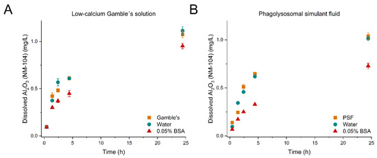 We observed that the hydrodynamic size of TiO2 (NM-104) was highly affected by the pre-dispersion medium, where water and 0.05% BSA formed dispersions with the lowest Zave while the particles agglomerated heavily when dispersed in the test media. However, the samples pre-dispersed in water and test media (low-calcium Gamble’s solution or PSF) showed comparable dissolution profiles (p-value: 0.5233 or p-value: 0.6167, respectively) with a significantly 1.2–1.3 fold higher amount of total dissolved Al2O3 after 24 h than after pre-dispersion in 0.05% BSA (Figure 1A,B). The dissolution profiles after dispersion with 0.05% BSA were significantly different from the water and test media dispersions (p-values in Table 6); however, the initial dissolution rates were not affected by the choice of pre-dispersion medium (Table 7). Therefore, a direct agglomerate size effect on dissolution was not observed in the dissolution of Al2O3 (NM-104). A total of 131.8 ± 22.0 µg BSA/mg was found to adsorb to TiO2 (NM-104) (Table 4); the protein adsorption appeared to affect the dissolution of Al2O3 at neutral (low-calcium Gamble’s solution) and acidic pH (PSF).