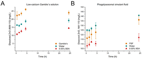 Dissolution profiles of ZnO (NM-110). (A) ZnO (NM-110) dispersed in low-calcium Gamble’s solution (■), water (●), and 0.05% BSA (▲). (B) ZnO (NM-110) dispersed in phagolysosomal simulant fluid (PSF) (■), water (●), and 0.05% BSA (▲). The dissolution tests were conducted for 24 h. Note the differences in the y-axis scale.