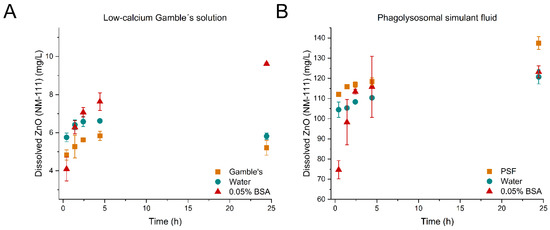 Dissolution profiles of ZnO (NM-111). (A) ZnO (NM-111) dispersed in low-calcium Gamble’s solution (■), water (●), and 0.05% BSA (▲). All dispersions were tested in low-calcium Gamble’s solution for 24 h. (B) ZnO (NM-111) dispersed in phagolysosomal simulant fluid (PSF) (■), water (●), and 0.05% BSA (▲). All dispersions were tested in PSF for 24 h. Note the differences in the y-axis scale.