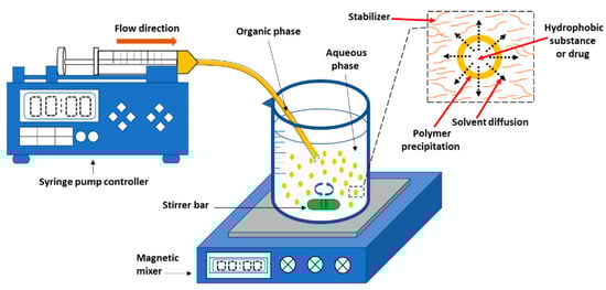 An organic phase is introduced to the aqueous phase during nanoprecipitation. The polymer and water-miscible organic solvent, which must be miscible in the aqueous medium, make up the organic phase, which has a diffusion effect [125,126,127,128,129,130,131]. To slow aggregation, the polymer must be insoluble in the aqueous solution, which might contain a stabilizer like a surfactant [132,133,134,135]. Dropwise addition of the organic phase to the aqueous phase with moderate agitation produces NPs [136,137]. Ultracentrifugation is used to collect the NPs, which are subsequently rinsed with water to remove the surfactant. The organic solvent evaporates, hardening the NPs, which are subsequently recovered by filtering, spinning, or freeze-drying [138,139]. Organic solvents that evaporate easily such as ethanol, acetone, hexane, or methylene chloride should be chosen as a polymer solvent. Binary solvent blends such as combinations of acetone with either ethanol or methanol can also be used. Likewise, a mixture of non-solvents can be used to form NPs in this method [140,141,142]. Figure 1 shows a schematic illustration of the nanoprecipitation process. According to Quintanar et al., the difference in surface tensions induces intrafacial turbulence and thermal disparities in the system, resulting in the production of continuous solvent eddies at the interface of both liquids. When the polymer aggregates on the hydrophobic drug surface as the solvent runs away (solvent diffusion) from low surface tension regions, nanocapsules are generated. [97].