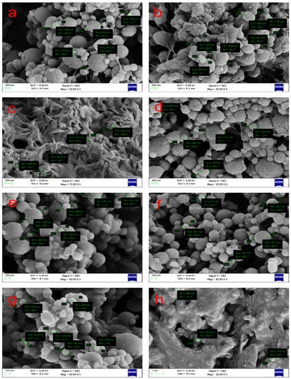 Scanning electron micrographs of synthesized P(3HB) NPs. (a–d) NPs were prepared using chloroform and (a) DMSO, (b) DMSO (loaded), (c) water (d) water (loaded), (e–h) ethyl acetate, and (e) DMSO, (f) DMSO (loaded) (g) water, (h) water (loaded). Adapted from Senthilkumar et al. (2018) [174].