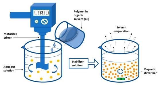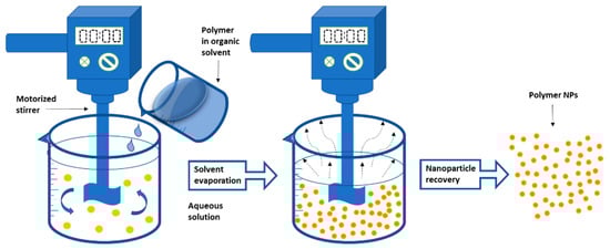 The solvent is then continuously evaporated while the NPs are recovered by ultracentrifugation [187,188]. The NPs are thoroughly rinsed with water and then lyophilized to remove the surfactants [189,190,191]. Figure 3 depicts a schematic illustration of the solvent evaporation procedure. The diameter of NPs can be controlled by adjusting the stirring speed, the viscosity of the aqueous and organic phases, and the type and concentration of the dispersing agent [192]. The solvent evaporation approach was used by Musyanovych et al. to make poly(l-lactide) (PLLA), PLGA, and poly(caprolactone) (PCL) NPs. The size of the NPs produced is affected by the type of polymer used. The smallest particle size was found in PLGA NPs, whereas the highest particle size was found in PCL NPs [192].
