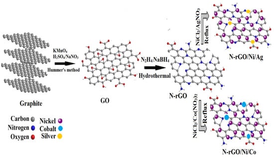 2.2. Synthesis of Nitrogen-Doped Reduced Graphene Oxide-Nickel/Sliver (N-rGO-Ni/Ag) Nanocomposite