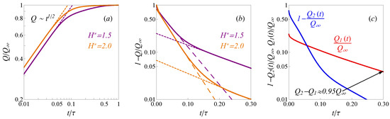 The charges of electrolyte components are conveniently defined in terms of average densities as . An example of the calculated time-dependent charges for subnanopore electrodes ( and ) at sufficiently high potential is shown in Figure 2a,b. A discussion of the used numerical methods can be found in Appendix C. As one can see from Figure 2a, the root-square law describes the notable part of the charging process at early times well. However, when the charge Q approaches the saturated value , the trend changes to the exponential one. Figure 2b shows that in the case of larger pores with , the charging up to almost 95% is described by the following equation:
