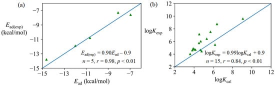 Linear correlations between experimental and calculated values: (a) experimental Ead(exp) and calculated Ead values for adsorption of acetonitrile, benzene, 1,4-dioxane, ethanol and toluene onto graphene in gaseous phase; (b) experimental logKexp and MD calculated logKcal values for adsorption of 15 aromatic compounds onto graphene in the aqueous phase.