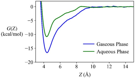 Before the MD simulation, one adsorbate molecule was arranged on the top of a three-layer BP adsorbent in a periodic box of 3.6 × 3.6 × 6.5 nm3 (Figure S1b). According to previous adsorption simulations about the carbon nanomaterials [,], Z was estimated to range from 3 to 15 Å in this study. A single window with the Z interval was adopted as the sampling space. The force was sampled in bins of 0.05 Å width along Z. G(Z) was normalized to zero at a distance of 14 ≤ Z ≤ 15 Å, where the energies reached a plateau as there were no interactions between BP and the adsorbates (Figure S2). The convergence of G(Z) in the free energy calculation was checked as detailed in the Supplementary Materials.