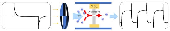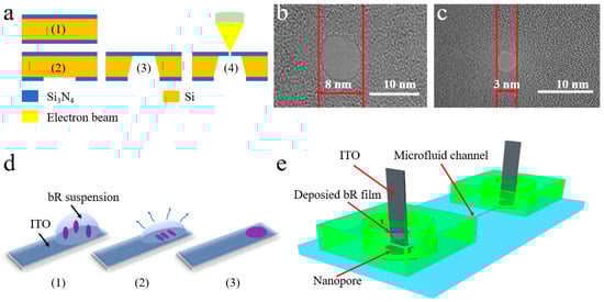 The TEM characterization [] of two devices with different sizes of nanopores is shown in Figure 2b,c (the scale bar is 10 nm). Both holes appear to be quasi-circular. Two parallel red lines are used to highlight the size of the nanopore (8 nm on the left and 3 nm on the right). These two devices with different size nanopores are made to study the effect of the size in a subsequent test.