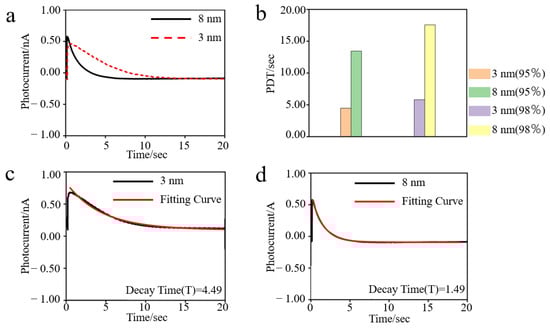 (a) The PDT is greatly affected by the changed nanopores. (b) The PDT in different indexes. (c) The fitting curve of 3 nm with a decay time of 4.49 s. (d) Fitting curve of 8 nm with a decay time of 1.49 s.