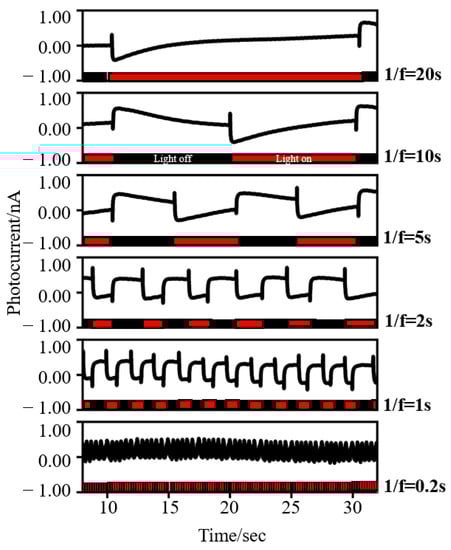 The photocurrent waveform changes with the light flickering frequency. f represents the flickering frequency of the induced light.