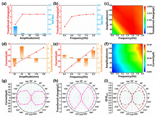 Figure 3. The performance of the S-TENG (1 units) under different vibration parameters. (a) The transferred charge variation with the vibration amplitude; (b) The transferred charge variation with the vibration frequency; (c) 3D contour of the transferred charge variation with the frequency and the amplitude; (d) The short-circuit current variation with the vibration amplitude; (e) The short-circuit current variation with the vibration frequency; (f) 3D contour of the short-circuit current variation with the frequency and the amplitude; (g) The azimuth dependence of the short-circuit current; (h) The azimuth dependence of the transferred charge; (i) The comparison between the S-TENG and the previous TENG on the azimuth map of the transferred charge (nondimensional).