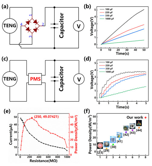 Figure 4. Charging the capacitance with the TENG (a) The diagram depicting the charging circuit; (b) The time series (within 50 s) of the voltages during charging with various capacitances; (c) The diagram depicting the charging circuit with the PMS; (d) The time series (within 5 s) of the voltages during charging with various capacitances (with the PMS); (e) The output current and the power density of the TENG with respect to resistance in the circuit; (f) A comparison of the output power density with other wave-driven TENGs [23,29,30,41,42,43,44].