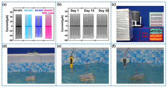 A series of examinations have primarily verified the robustness of the S-TENG in marine environment. For example, as the relative humidity is raised from 40% to 60%, the output performance (i.e., current) yields a reduction of around 13% (see Figure 6a), which is acceptable for marine equipment. In fact, it is believed that the S-TENG implemented in a waterproof module is subject to even less influence from the environmental humidity. Repeated experiments throughout a month reveal that the S-TENG’s performance is quite stable (see Figure 6b).