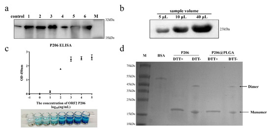 Identification of recombinant protein P206; (a) expression of P206 under different induced conditions (control: without IPTG induction; 1: input, 15 °C 16 h; 2: input, 37 °C 4 h; 3: inclusion body, 15 °C 16 h; 4: supernatant, 15 °C 16 h; 5: inclusion body, 37 °C 4 h; and 6: supernatant, 37 °C 4 h). (b) Western blot data for different P206 concentrations combined with anti-ORF2 antibody; (c) OD value of protein P206 at 450 nm and TMB staining; and (d) native PAGE data for protein P206 and PLGA@P206.