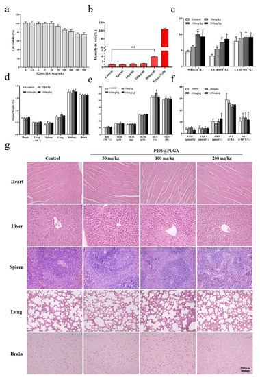 Different concentrations of P206@PLGA (0.5–500 μg/mL) were co-cultured with Huh7 cells for 24 h, and the cytotoxicity was detected by MTT assay. P206@PLGA did not inhibit cell growth when the concentration of P206@PLGA was 0.5−10 μg/mL; the cell survival rate decreased with increasing drug concentration (Figure 3a). The cell survival rate was approximately 75% at a concentration of 500 μg/mL, and cell growth was still not significantly inhibited (the cell survival rate was less than 70%). This observation indicated that P206@PLGA exhibited excellent safety in in vitro cell experiments. The red blood cell hemolysis test showed that P206@PLGA did not exhibit hemolysis in the concentration range of 1–100 μg/mL (Figure 3b), and no red blood cell abnormalities were observed under a microscope (Figure S4). P206@PLGA groups with 3 different concentrations (50, 100, and 200 mg/kg) were administered to ICR mice via tail vein injection. No significant changes were found in indicators, such as the organ/weight ratio, serum biochemistry, and blood routine (Figure 3d–f), while the lymphocyte counts increased significantly (Figure 3c). Moreover, tissue sections of the heart, liver, spleen, lung, and brain of each group of mice showed no obvious lesions (Figure 3g).