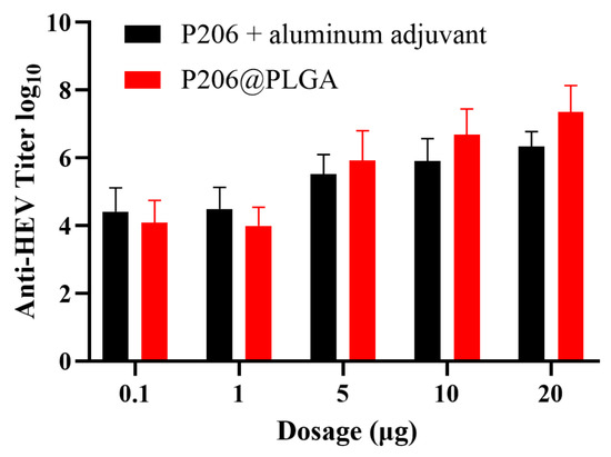 Determination of anti-HEV antibody titer in the serum of BALB/c mice eight weeks after immunization with P206 plus aluminum adjuvant and P206@PLGA. The antibody titer induced by P206@PLGA in the 20 μg group was significantly higher than that in the P206 plus aluminum adjuvant group (p < 0.05).