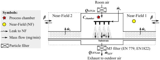 NPs enter the chamber via atomization of the suspension by the spray nozzles. The NP suspension mass flow, (mg-NP/min) is calculated from the suspension feed rate, (mL/min), and NP concentration CNP (wt.%). Atomized NPs are transferred to the substrate, (mg-NP/min) and a fraction is released to the chamber air Cchamber,NP (mg-NP/m3). The released NPs from the spraying process are mainly removed by LEV and exhausted through a filter to outdoors (mg-NP/min). However, a small fraction is leaked into NF from the chamber and conveyor belt cover openings (mg-NP/min). Another fraction is escaped to the pre-heater and oven (mg-NP/min) and deposited onto chamber surfaces (mg-NP/min). Assuming small NPs escape and surface deposition, i.e., mg-NP/min, the NP mass balance inside the chamber is: