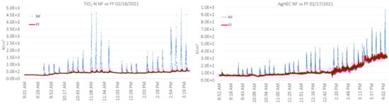 Measurements took place in the period 15–18 of February 2021. On 15 February, instruments were set-up and background concentration measurements were carried out with offline particulate matter (PM) samplers. On 16 February, TiO2N NPs were sprayed both on PMMA and textile substrates, while on 17 February, AgHEC NPs were sprayed on textiles. On 18 February, additional experiments were carried out (data not shown), and instruments were packed off. During the campaign, measurements were obtained at three different positions: NF, FF, and inside the spray chamber (Figure 1A,B shows NF instrumentation; see also additional photos from []).