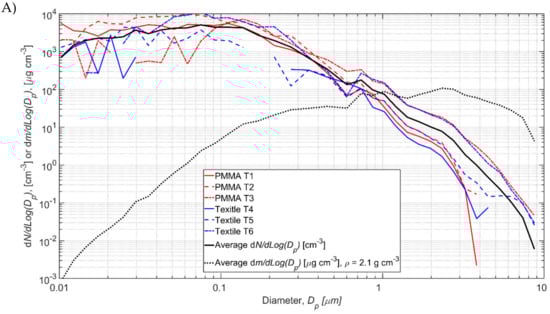 The particle density was calculated for both NPs process emissions from the respective NF NP,i and mP,PM process concentrations. Effective density takes into account particle porosity and shape [] and it can be calculated from mass and volume concentrations []. First, NP,i concentrations were averaged over all tests, converted first to volume size distribution and then to a mass distribution mP (μg/m3). The density was adjusted so that the averaged mass concentration over PM sampling period was similar as the mP,PM mass concentration measured from the NF. The following assumptions were used: