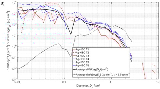 Mobility and optical size of TiO2 and Ag particles are not the same because the optical size also depends on the particle refractive index and shape [,,]. The refractive index and extinction coefficient at 632.8 nm are for TiO2 (rutile) 2.8736 + 0i and for elemental Ag 0.056 + 4.27i, respectively. These vary significantly from the coefficient used by the OPC. For example, for highly agglomerated TiO2 NPs [], the optical diameter was 90 nm + 0.14 times the mobility diameter (Supplementary Material S3). However, here, TiO2 particles were spherical, doped with nitrate and the relation cannot be used in this case. Agglomerate density reduces with increasing agglomerate size when the primary particle size remains the same that is shown, e.g., for soot agglomerates [,]. This assumption overestimates the large particles mass fraction and underestimates small particles mass fractions. The background concentration assumption is expected to cause <10% error on the process particle mass concentration calculation.