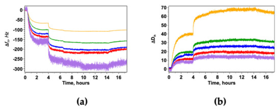 where n is the overtone number and ρq (2.648 g/cm3) and µq (1011 g/cms2) are the density and the shear modulus of the quartz crystal, respectively [51]. For thicker or softer films, the resonance frequency is affected not only by the mass attached to the surface but also by the rigidity of the adsorbed layer since frictional losses occurring in the adsorbed layer may lead to a damping of the oscillation that depends on the viscoelastic properties of the material. Thickness and viscoelastic properties of the adsorbed film were obtained by means of the commercial software QCMBrowse (KSV Instrument Ltd., Helsinky, Finland) fitting the data to a two-layer model that relates the measured Δf and ΔD of all overtones, to the viscoelastic properties of the adsorbed layer and the surrounding solution using a Voigt-based model previously used for similar systems [52,53].