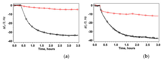 Change of Δf3/3 after addition of HWL-N (a) and HWL-F (b) to the nanostructured platform. Bare AgNC/NS arrays: red circles; GO veiled AgNC/NS arrays: black squares. Concentration of lysozyme = 1 × 10−6 M in all cases.